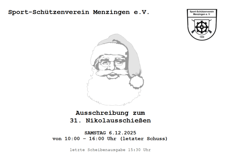 Das 31. Nikolausschießen einschl. dem 2. KK-Militärgewehrschießen und 2. offenem Dienst-/Revolverschießen findet am Samstag, den 06.12.2025 statt.